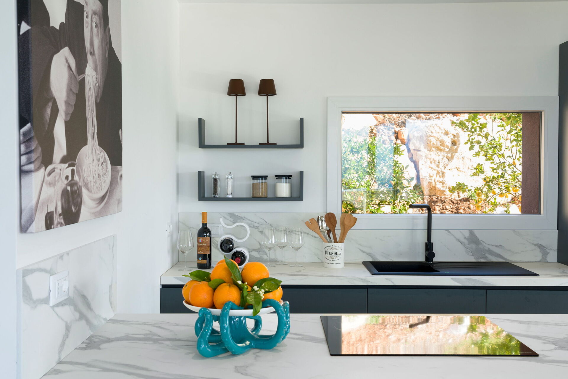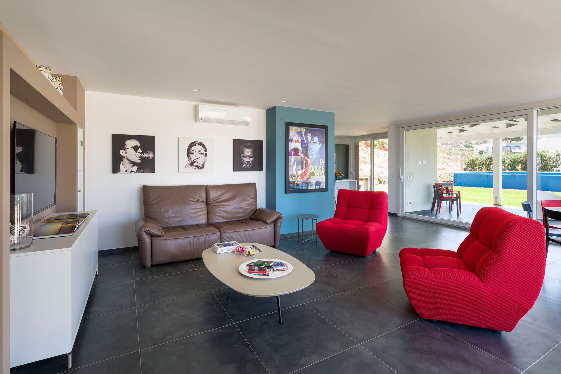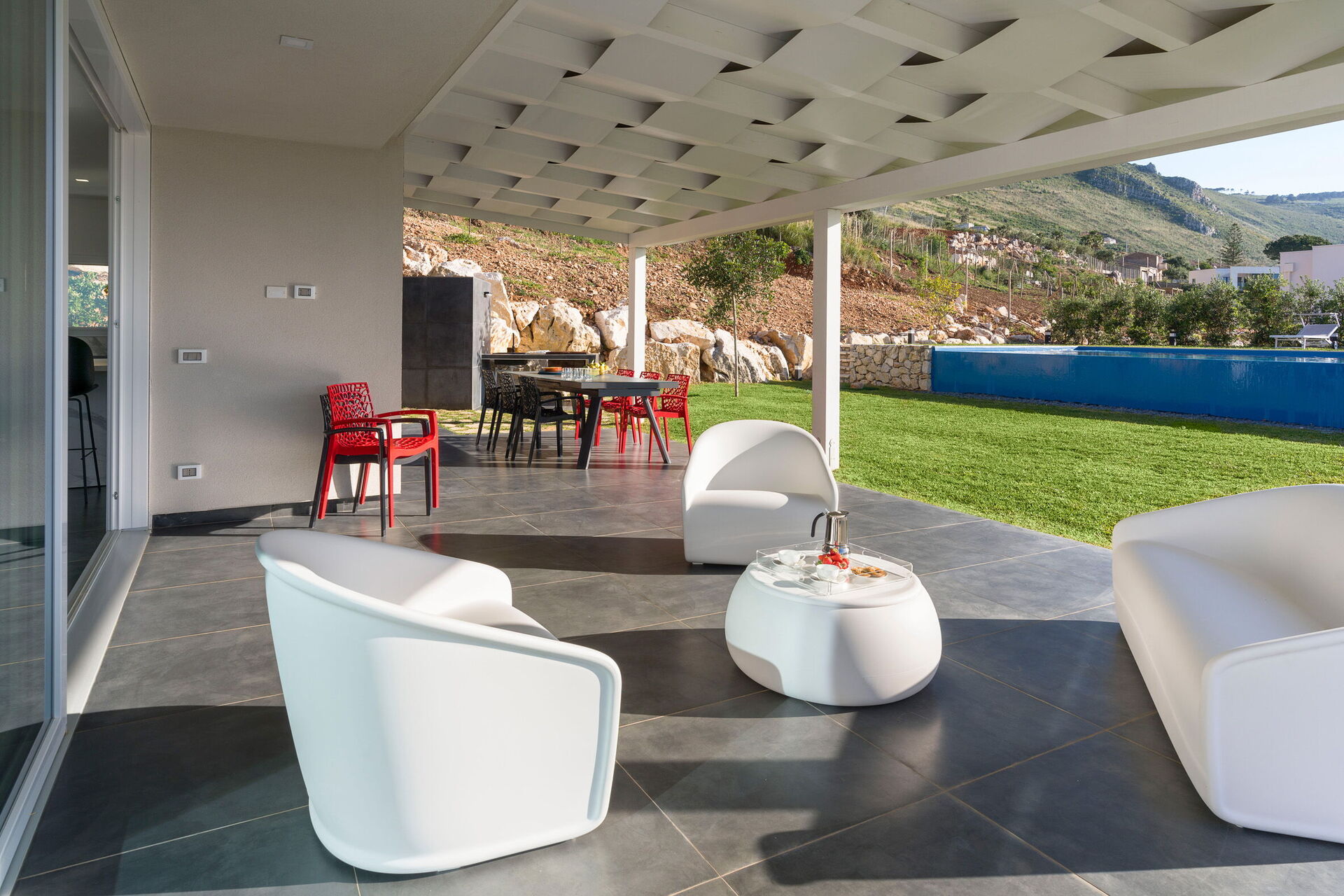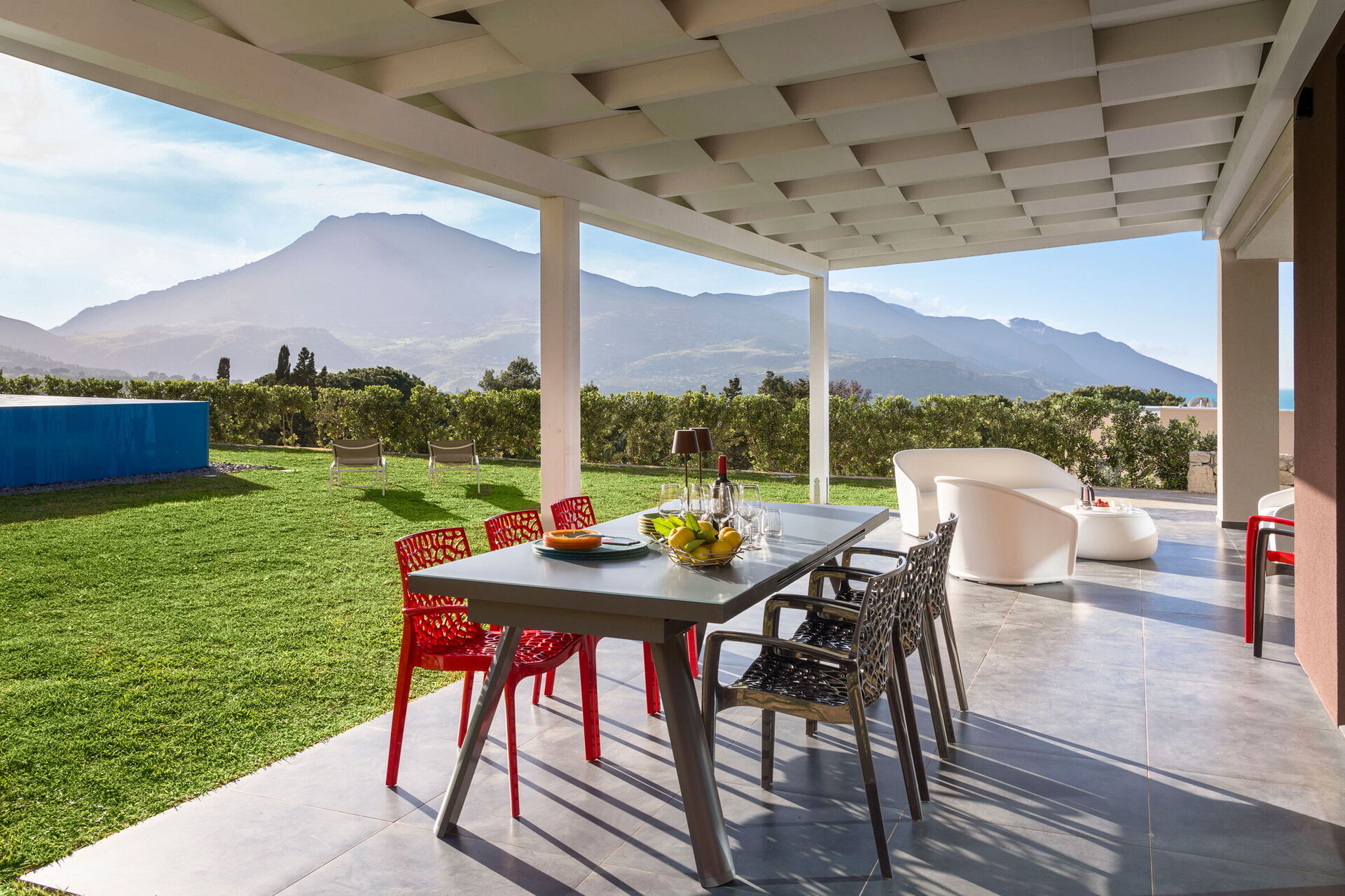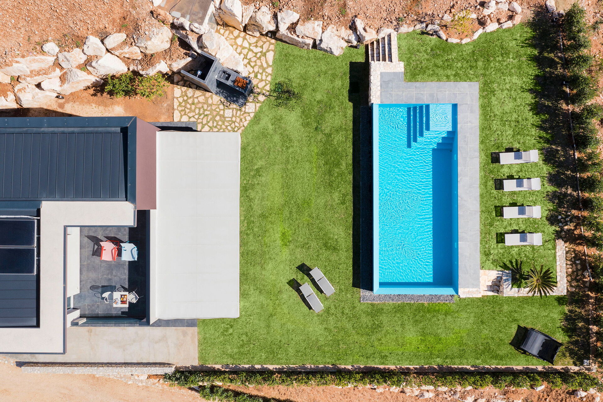 The villa is surrounded by a large, lawned garden where you will find the private infinity pool and a veranda equipped for outdoor dining and relaxing on summer days.