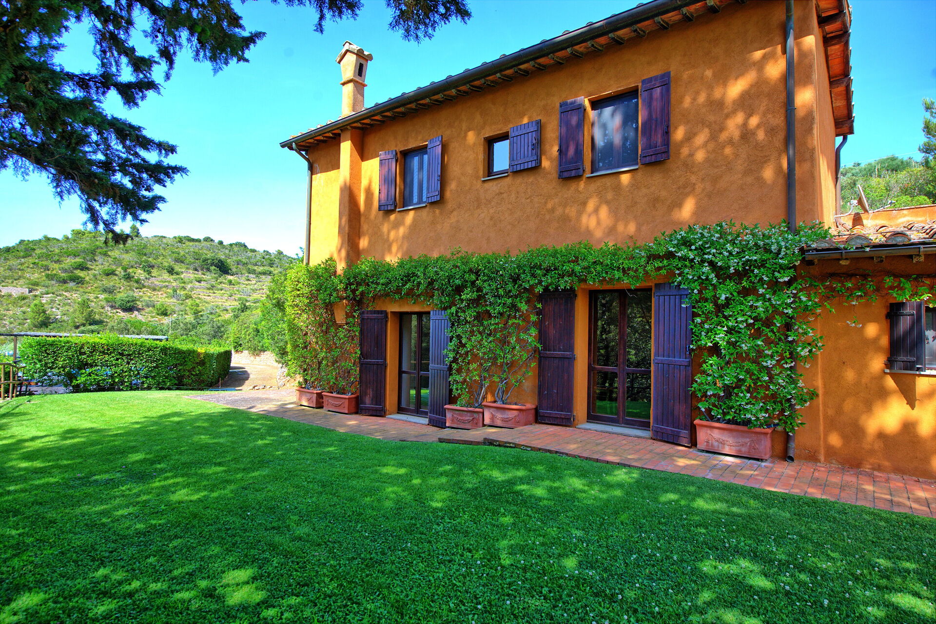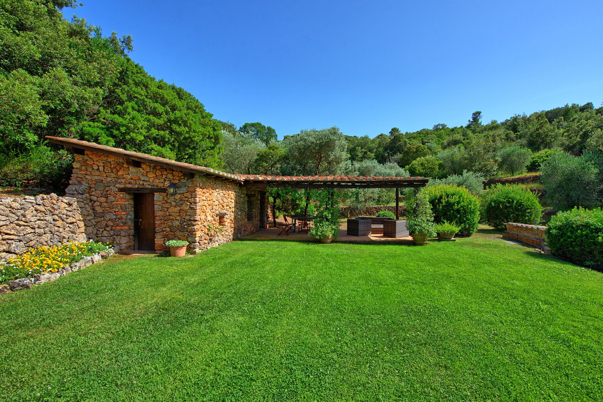 Nearby Porto Santo Stefano has ferry service to the islands of Giglio and Giannutri. The Argentario promontory is rich with rocky coves reachable on foot or with a boat rental; Feniglia Beach, the most famous sandy beach, is about 12 km from the villa.