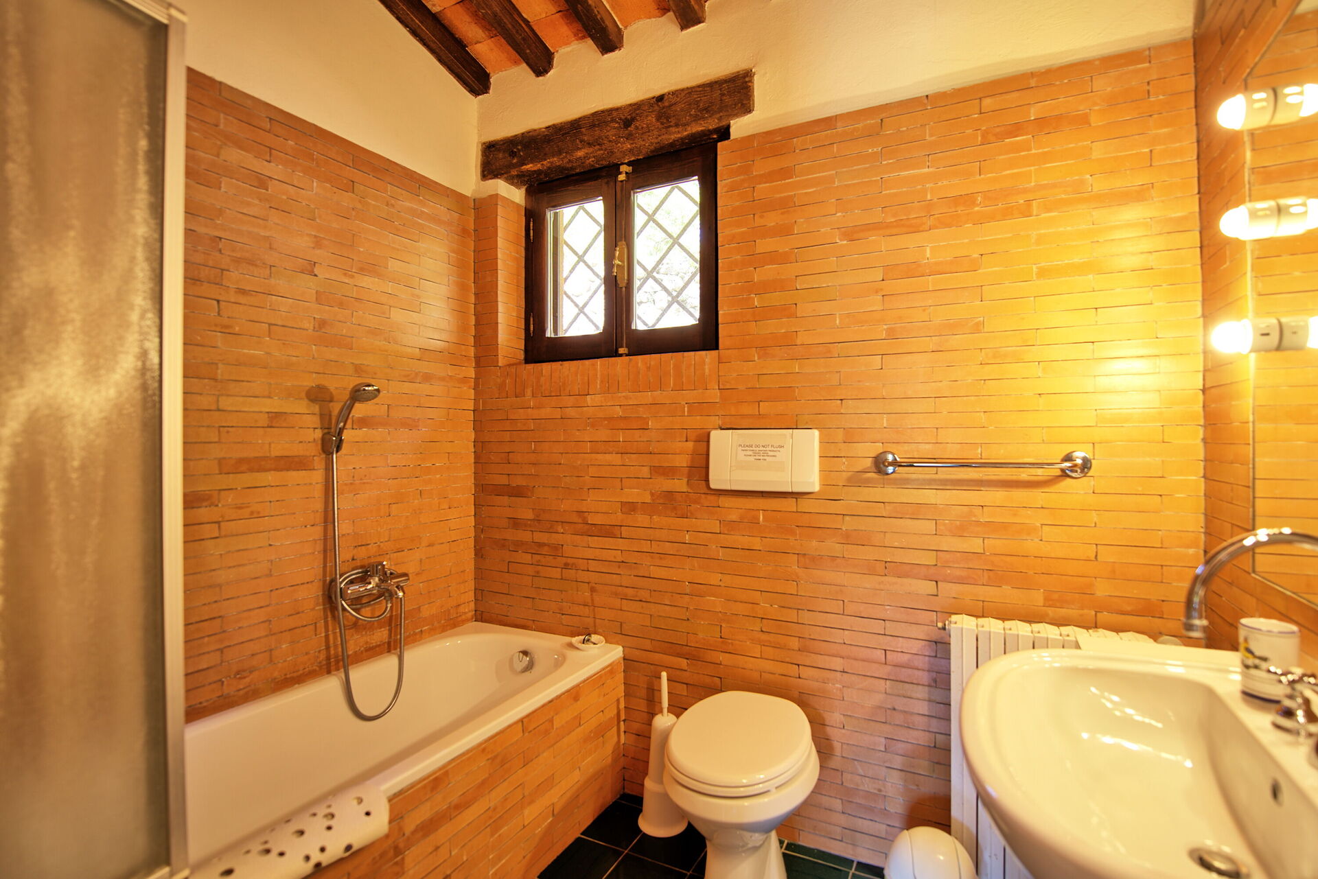 Ground floor: entrance and living room, dining area, kitchen, WC, bedroom with 2 single beds and private bathroom with bathtub and shower attachment.