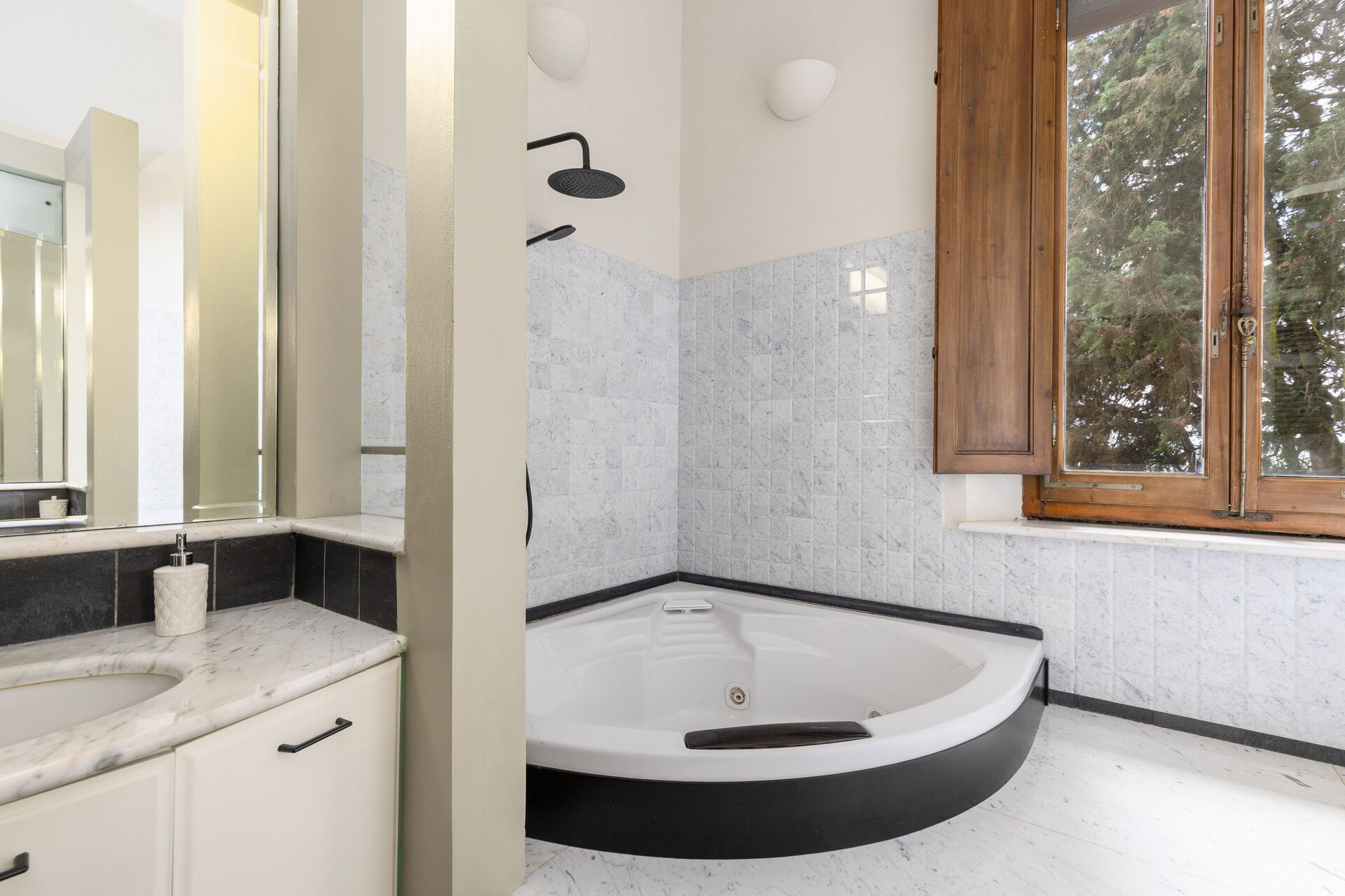 First floor: double bedroom (king size bed) with a private bathroom with shower and bathtub, bedroom with 2 single beds, bathroom with whirlpool tub; double bedroom with private bathroom with shower and bathtub; double bedroom with a shower, sink and wc in a corner of the room.